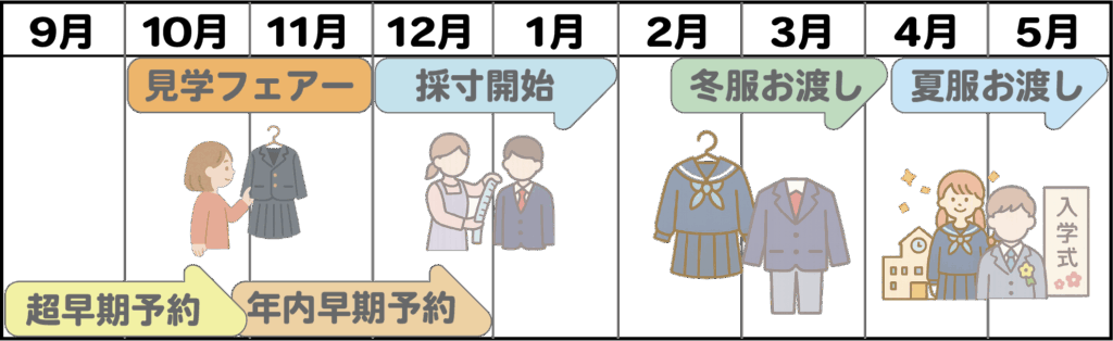 冬服は3月初旬から、夏服は4月下旬から随時お渡しいたします。